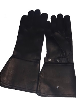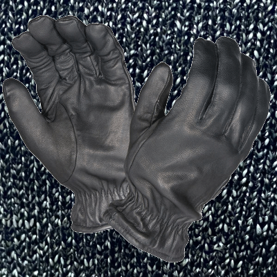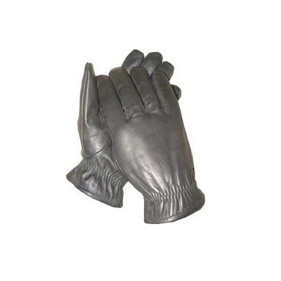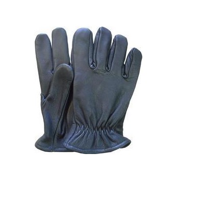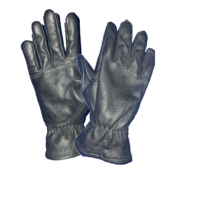 Three (3) rows of silking on back of glove raised silking extending palm & all fingers for "sure" grip All seams to be lock stitched, outseam sewn with 100% nylon thread or equivalent i.e. polyester core, cotton wrapped 5.5 " leather bound cuff with gore and adjustable strap on back, complete with two (2) adjustable black matte finished snaps Drum Dyed Black Full Grain Cowhide Belly Chrome tanned and shiny aspect processed Leather free of Pentachlorophenol (PCP) and free of the AZO dyeing products with approximately 0.8-1mm gage thickness. Thread being used in the specimen is high quality 100% black nylon thread 3.5 - 4 oz black cowhide cuff split