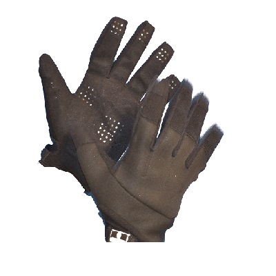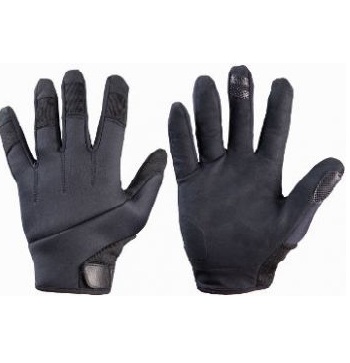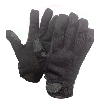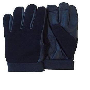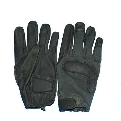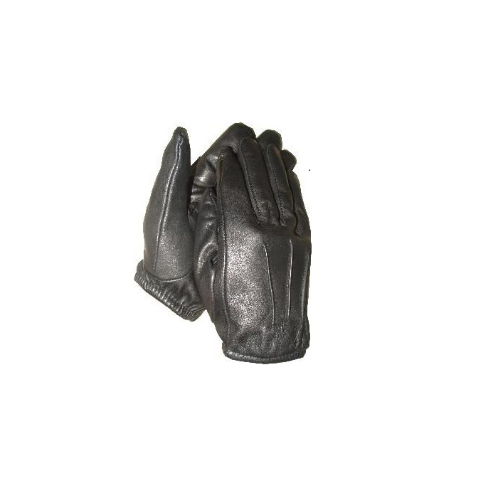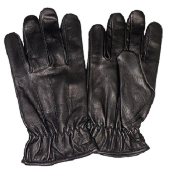 Construction consisting of three (3) rows of silking on back of glove ;Raised silking extending palm & all fingers for "sure" grip ; All seams to be lock stitched, outseam sewn with 100% nylon thread or equivalent i.e. polyester core, cotton wrapped; 5.5 " leather bound cuff with gore and adjustable strap on back, complete with two (2) adjustable black matte finished snaps Drum Dyed Black Full Grain Cowhide Belly Chrome tanned and shiny aspect processed Leather free of Pentachlorophenol (PCP) and free of the AZO dyeing products with approximately 0.8-1mm gage thickness. Thread being used in the specimen is high quality 100% black nylon thread