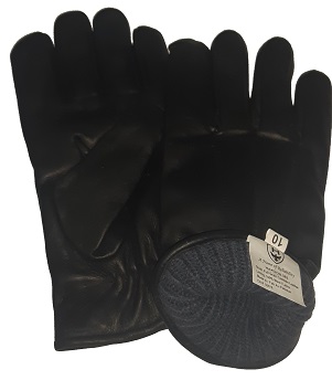 Drum Dyed Black Full Grain Cowhide Belly Chrome tanned and shiny aspect processed Leather free of Pentachlorophenol (PCP) and free of the AZO dyeing products with approximately 0.8-1mm gage thickness. specimen lining consists of charcoal grey bulky knit three (3) ply wool and weighs approximately 90gm Thread being used in the specimen is 100% TEX-46 BLACK nylon thread 6mm natural shaded braided elastic. Specimen is constructed with shirred wrist 3 zig zags, and with a turned hem and sack wrist. Inseam sewing was used.