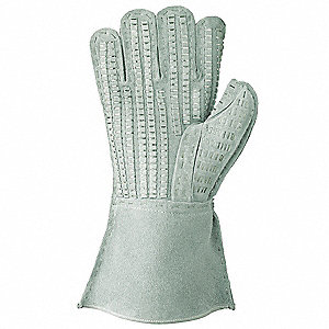 A Clute cut design with a five-inch gauntlet allows for a seamless palm. The palm and the palm side of the fingers and thumb are reinforced with leather strips to protect against cuts and punctures. The added protection also makes this glove ideal for handling sharp steel or glass.